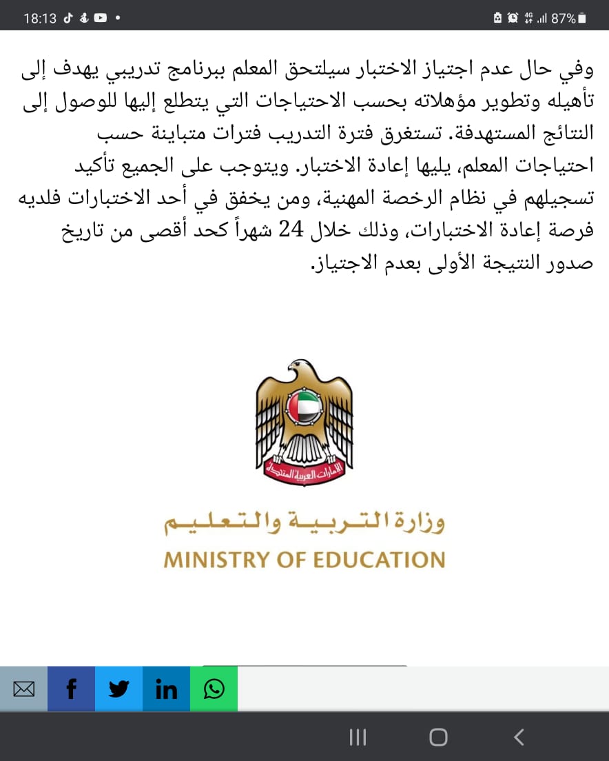 بحسب ما نشرت وزارة التربية في صحيفة البيان في عددها الصادر بتاريخ ١٩ يناير ٢٠٢٠ فإنه في حال عدم اجتياز الاختبار سيلتحق المعلم ببرنامج تدريبي يهدف الى تأهيله وتطوير مؤهلاته بحسب الاحتياجات التي يتطلع إليها للوصول الى النتائح المستهدفة .